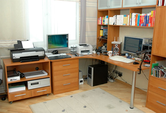Вот сегодня привезли и установили. Просто отдельная бандура на колесиках (для удобства), сделанная под высоту столешницы, с полками под второй комп, сканер (чтобы крышка открывалась) и большой принтер. Получилось, на мой взгляд, очень удобно и функционально. И смотрится хорошо.