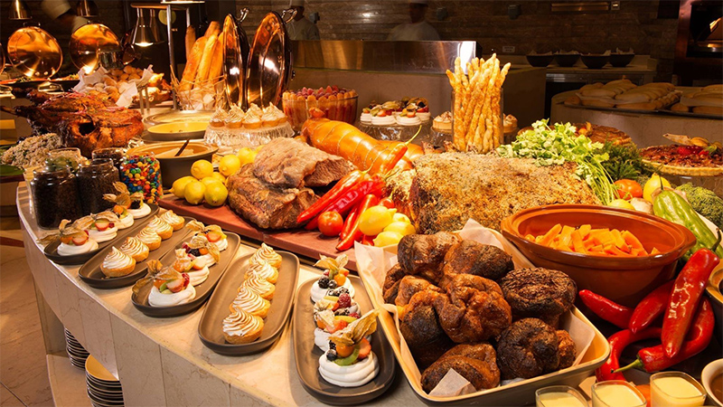Были всякие салаты, вкусные оливки в масле, сыры, фрукты и запеченная форель - очень вкусно!