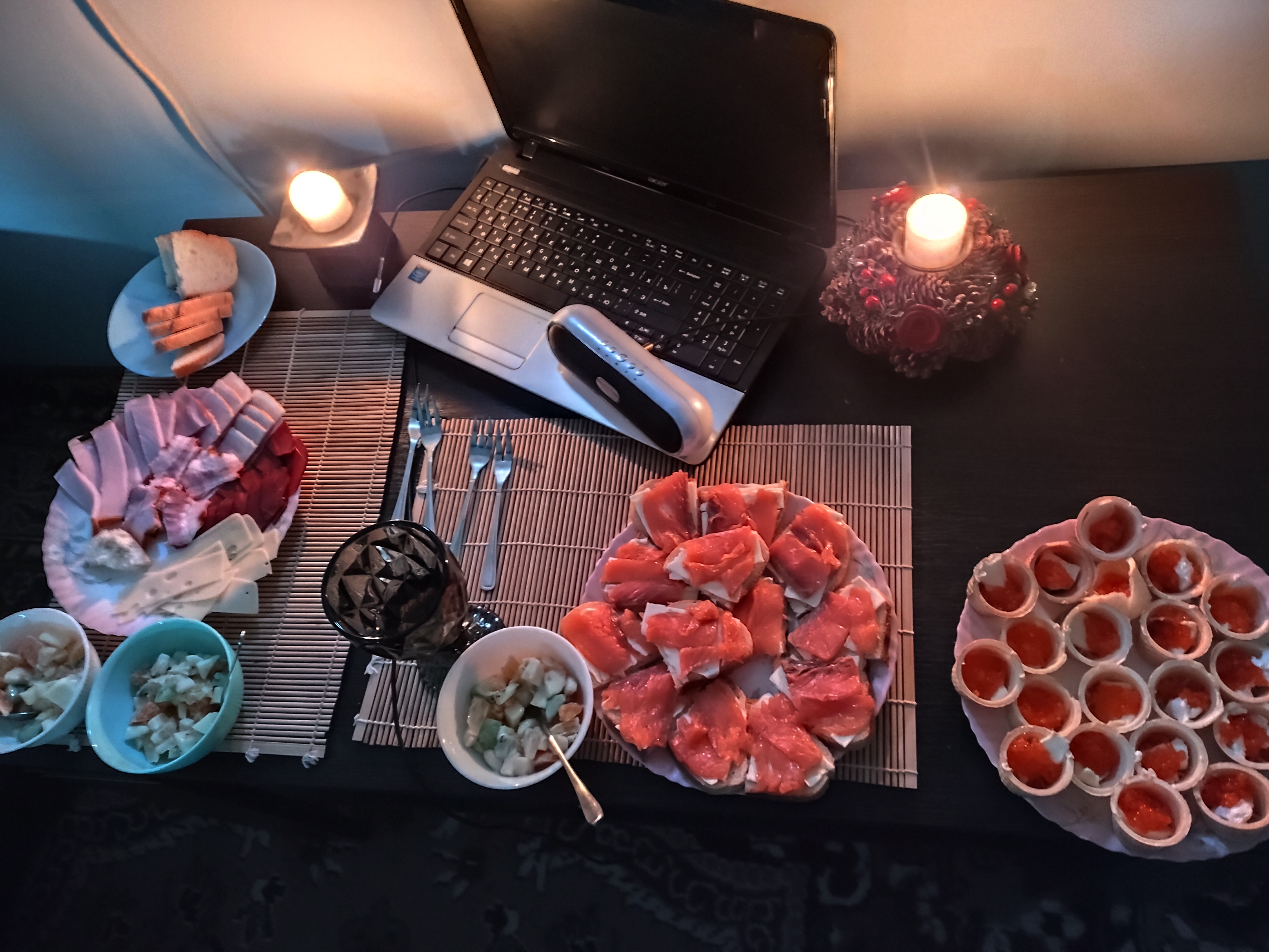 Я решила в этом году сильно не заморачиваться. Сделала картофельную запеканку с куриным фаршем по рецепту из Просто кухни, зимний салат и тарталетки с творожным сыром и икрой минтая, ну и сыр и колбаска. И покупной тортик к чаю. А пили тетушкин компот из тёрна, ибо брат за рулём, а мне алкоголь в одно лицо уже здоровье не позволяет.