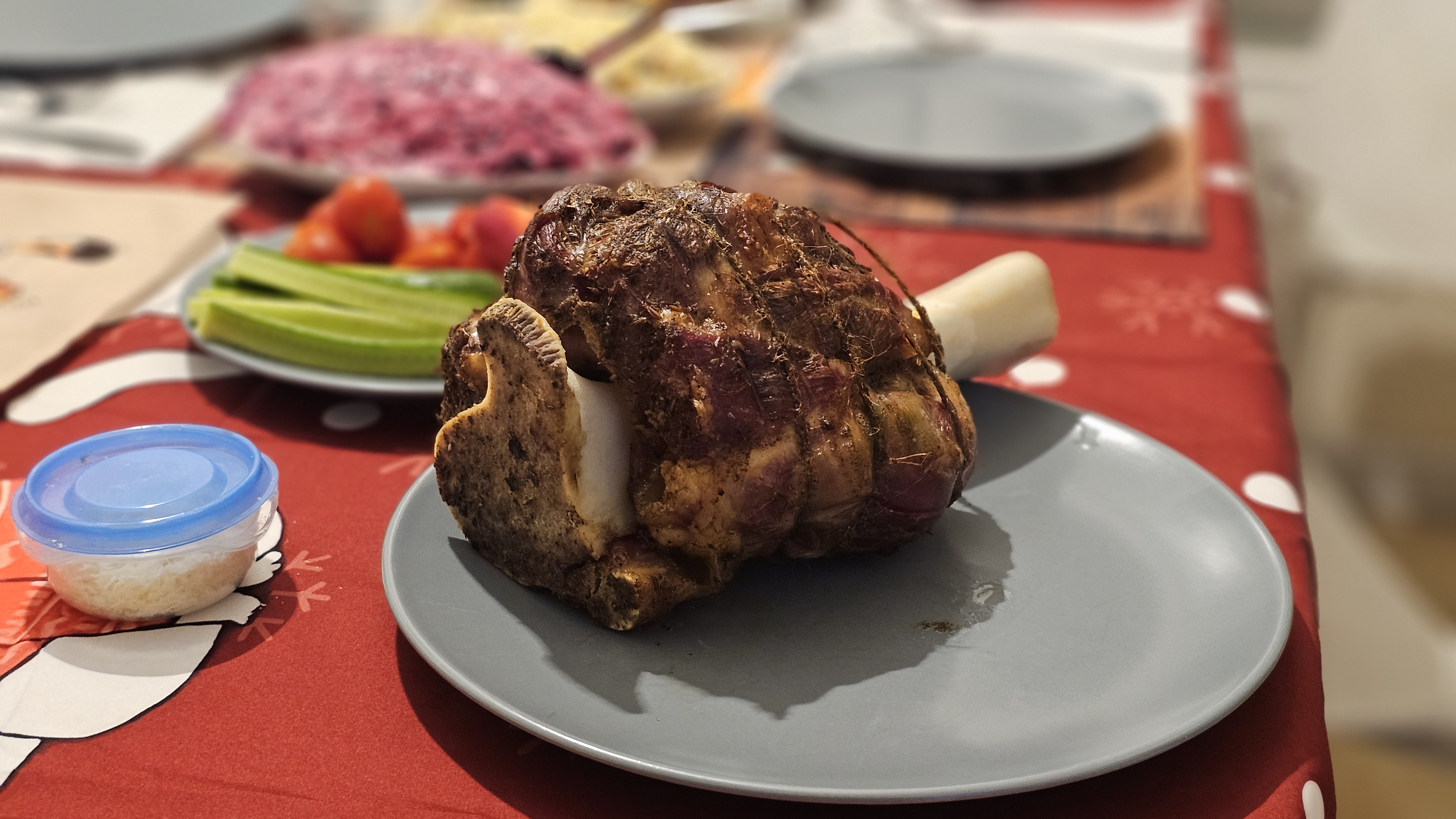 Оливье с дайконом; салат с сыром, яблоком и яйцами; гренки из ржаного хлеба со шппотами и запеченая цесарка с картофельным гратеном. Пили безалкогольное игристое Монетто, жена оч. любит. На десерт шоколадка 70% с фисташками (а ля дубай).