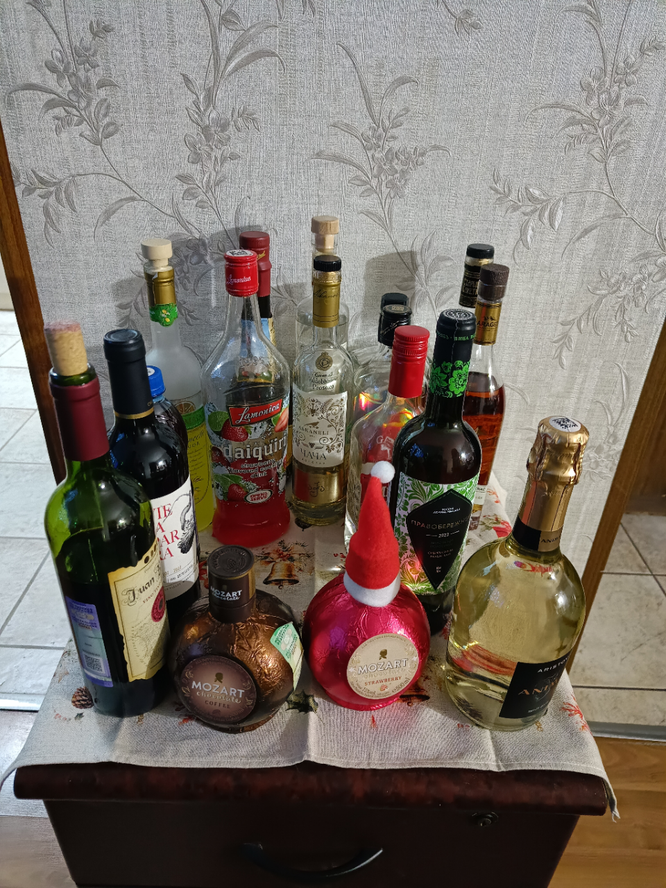 А мини-бар был такой (это не все) - вино, армянский и грузинский коньяки, виски, текила, самогон и ликеры. Пеший поход домой на 6 км при -13 немного отрезвил 😄