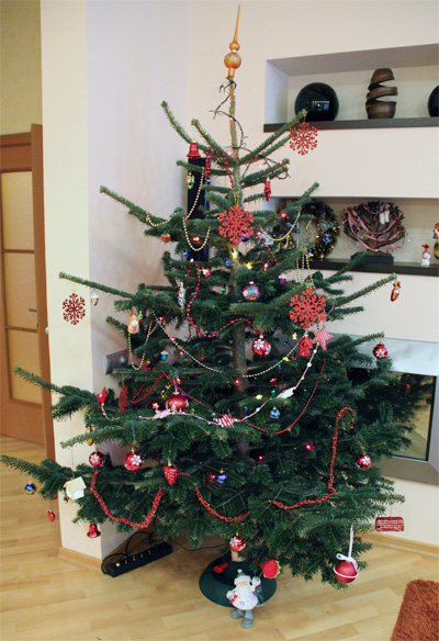 Страшненькая, если честно. Я у нас за 50 баксов купил двухметровую ель - густая конусообразная, как с картинки. Правда половина игрушек под углом висит из-за густоты веток. Зато игрушками, снежинками, гирляндами облепил. Стоит, пьёт по три литра воды в день с аспирином.