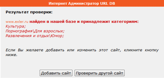 Наконец-то выяснил, к каким категориям относится мой сайт - это по базе IAdmin. В принципе, мужики, конечно, правы. При наличии на сайте разделов sex.exler.ru и www.exler.ru/pussy - это чистая порнография!