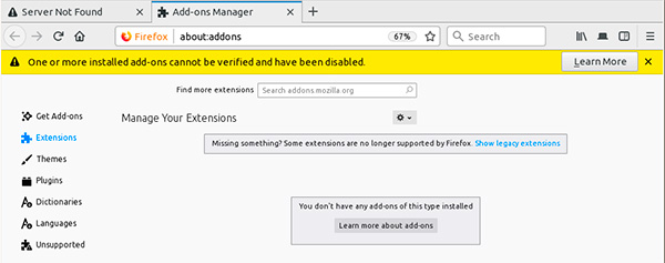 Компания Mozilla предупредила о возникновении массовых проблем с дополнениями к Firefox. У всех пользователей браузера дополнения оказались заблокированными из-за истечения времени жизни сертификата, применяемого для формирования цифровых подписей. Кроме того, отмечается невозможность установки новых дополнений из официального каталога AMO (addons.mozilla.org).