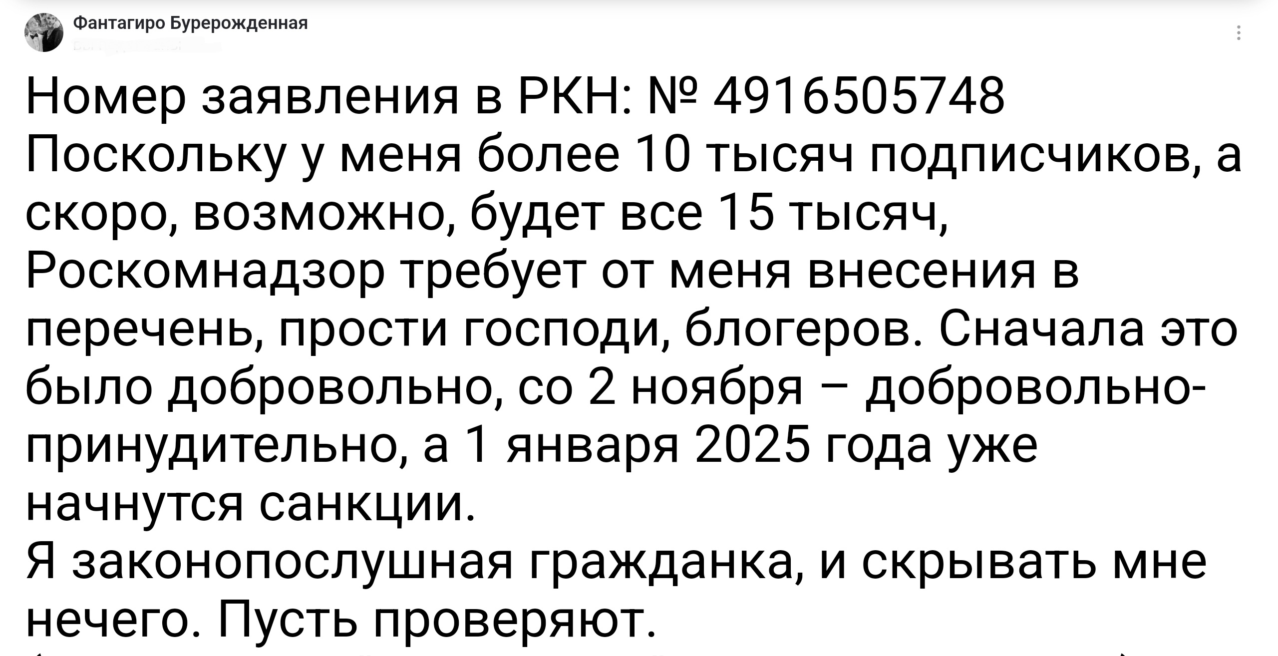 Вы, наверняка, помните, что Роскомговно обязало всех владельцев блогов и ТГ-каналов с аудиторией более 10 тысяч человек зарегистрироваться в Роскомговне, предоставив о себе всю личную информацию, каковая в Роскомговне, разумеется, будет находиться в полной безопасности, и ее будут при каждом запросе предоставлять товарищу майору, также эта информация, конечно же, будет продаваться в Даркнет, ибо товарищам из Роскомговна тоже нужна хоть какая-то, но подработка.