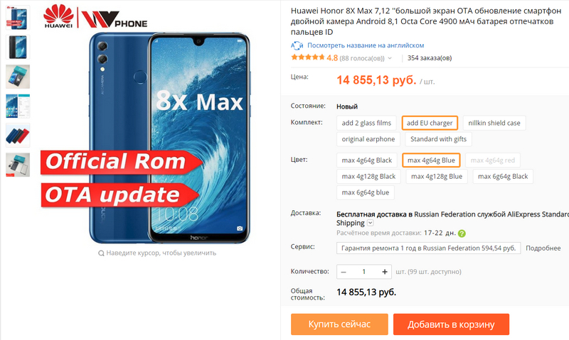Upd: Так, оказывается, Honor 8X, который продается в российском магазине Huawei - вполне себе с NFC! Стоит 18 тыров. Это не 8X Max, но тут дисплей тоже 6,5". Ну тогда возьму у китайцев Honor 8X (а не Max), а ссылку дам на российский магазин.