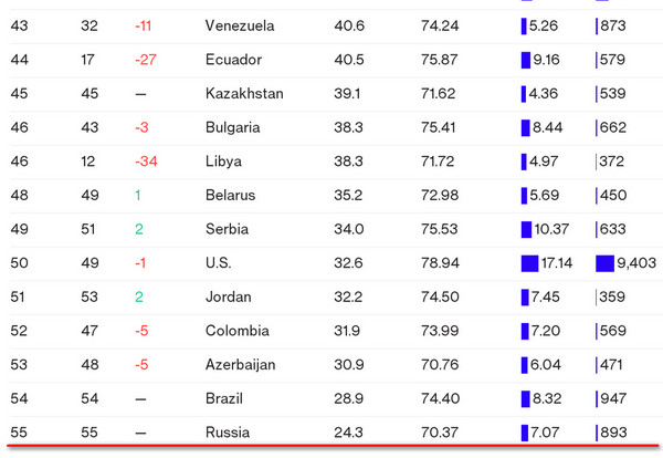 На самом последнем месте среди 55 стран. Впереди Венесуэла, Эквадор, Ливия и так далее.