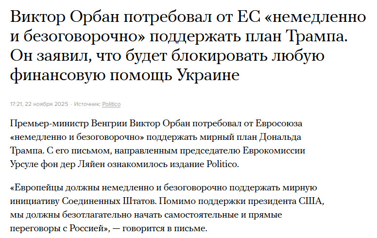 Оно, конечно, понятно, что этот "мирный план" - набор из достаточно диких пунктов, одна часть из которых принципиально невыполнима, другая - категорически неприемлема. А уж тот факт, что Трамп жестко наседает на Зеленского, требуя эту белиберду немедленно подписать, - он тоже очень показательный.