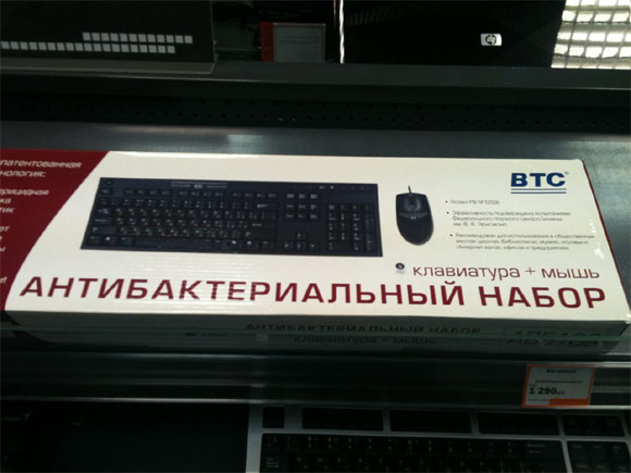 Как известно, клавиатура и мышь - рассадники всяких бактерий. Потому что некоторые, значить, люди, садятся, так сказать, мацать по клавишам, предварительно не помывши руки. И на клавах бактерии так и кишат, так и кишат. Но от этого есть спасение! Нет, не банальное мытье рук перед заклавьем! Компания BTC выпустила антибактериальный набор - клаву и мышь. Стоит только поставить этот набор в помещение, как бактерии, увидев надпись, начинают так хохотать, что просто лопаются от смеха. А вот зря они смеются! Потому что клава и мышь пропитаны специальным коагулянтом-антиоксидантом Петрика-Шметрика, так что теперь руки можно не мыть никогда - ни одна бактерия не выживет!