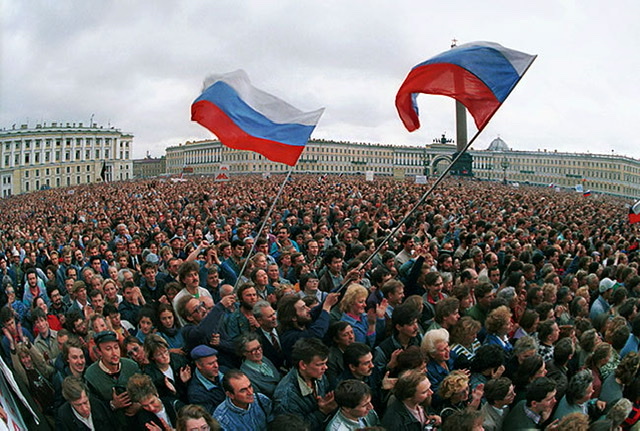 В 89-91м выходили с бело-сине- красными флагами и называли их российскими.