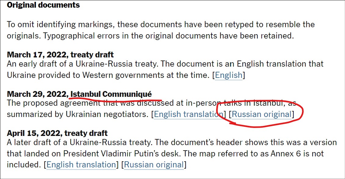 Интересно, что всю эту байду про якобы подписанное стамбульское коммюнике (мы сто раз обсуждали, что там было на самом деле, повторяться не будем) многократно произносил Путин - именно такими словами. И про вмешательство Бориса Джонсона - тоже заявления Путина.