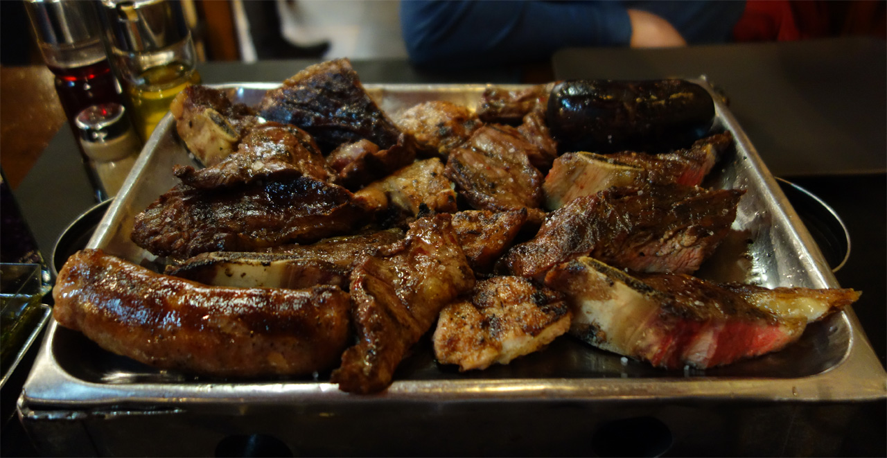 Так какова была моя радость, когда я обнаружил в Матаро (это городок, находящийся совсем рядом с Барселоной, название его романтично переводится как "Бойня") - аргентинский ресторанчик "Malambo". И он оказался действительно аргентинский и там отлично делают мясо, причем самое разнообразное. Коронное блюдо ресторана - так называемая мясная паррильяда (parrilada; parilla - это решетка гриля). Паррильяда - это набор продуктов одного вида, приготовленных на решетке. У нас это называется "мясная тарелка" или "мясной поднос". Бывает мясная паррильяда, рыбная, овощная и так далее. (На Кипре и в Греции такая штука называется мезе.)