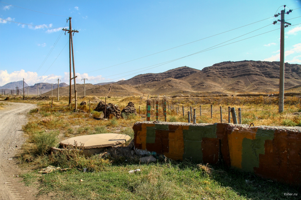 Дорога перегорожена, стоит блокпост. Вон на тех холмах справа во время войны сидели снайперы и простреливали эту территорию. Мы, когда сюда ехали, километров за пять до этого места остановились купить хурмы у бабушки, торгующей у дороги. Бабушка спросила, куда мы едем. Когда мы ответили, что в Ерасх, бабушка сказала: "Вы острожнее, там до сих пор снайперы постреливают".