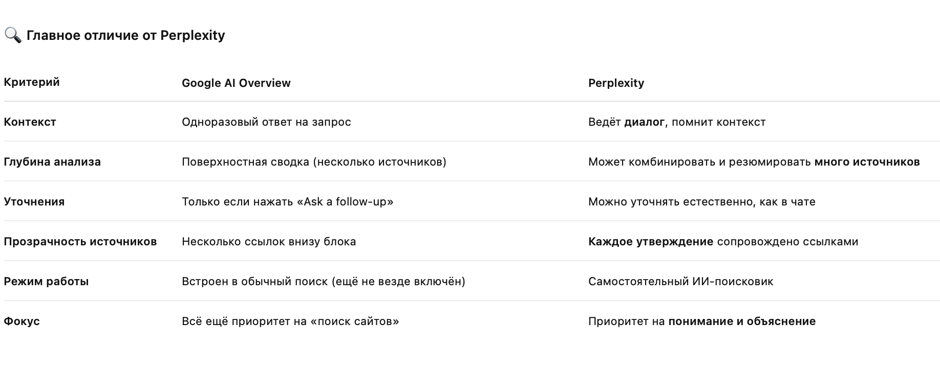 Сравнивать надо не с AI Overview, а с AI Mode. Вот там будет полный паритет, ну кроме того, что в Perplexity можно между моделями разных поставщиков переключаться.