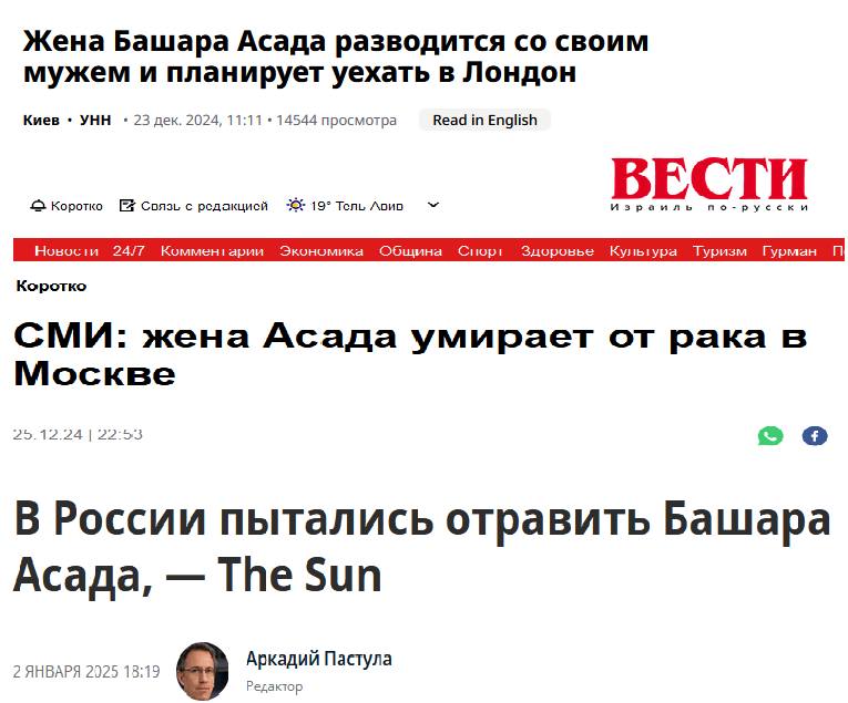 Британский таблоид The Sun сообщает, что Башара Асада в РФ пытались отравить. Но его как-то спасли - то ли клизму поставили, то ли наоборот - подробности они не знают.