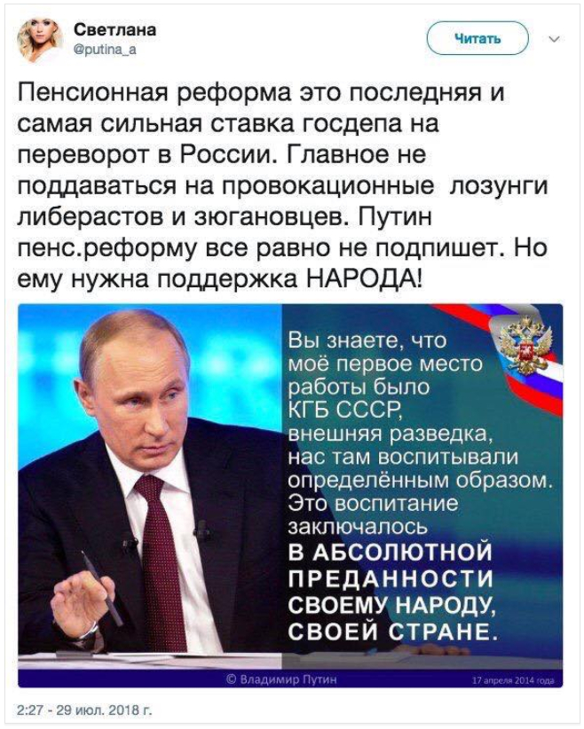 "....есть эта пенсионная реформа изначально была профанацией. Никто не собирался ничего реформировать. Цель была – максимальным образом взбесить народ против власти вообще и против лично Путина в частности." ОМ ЭМ