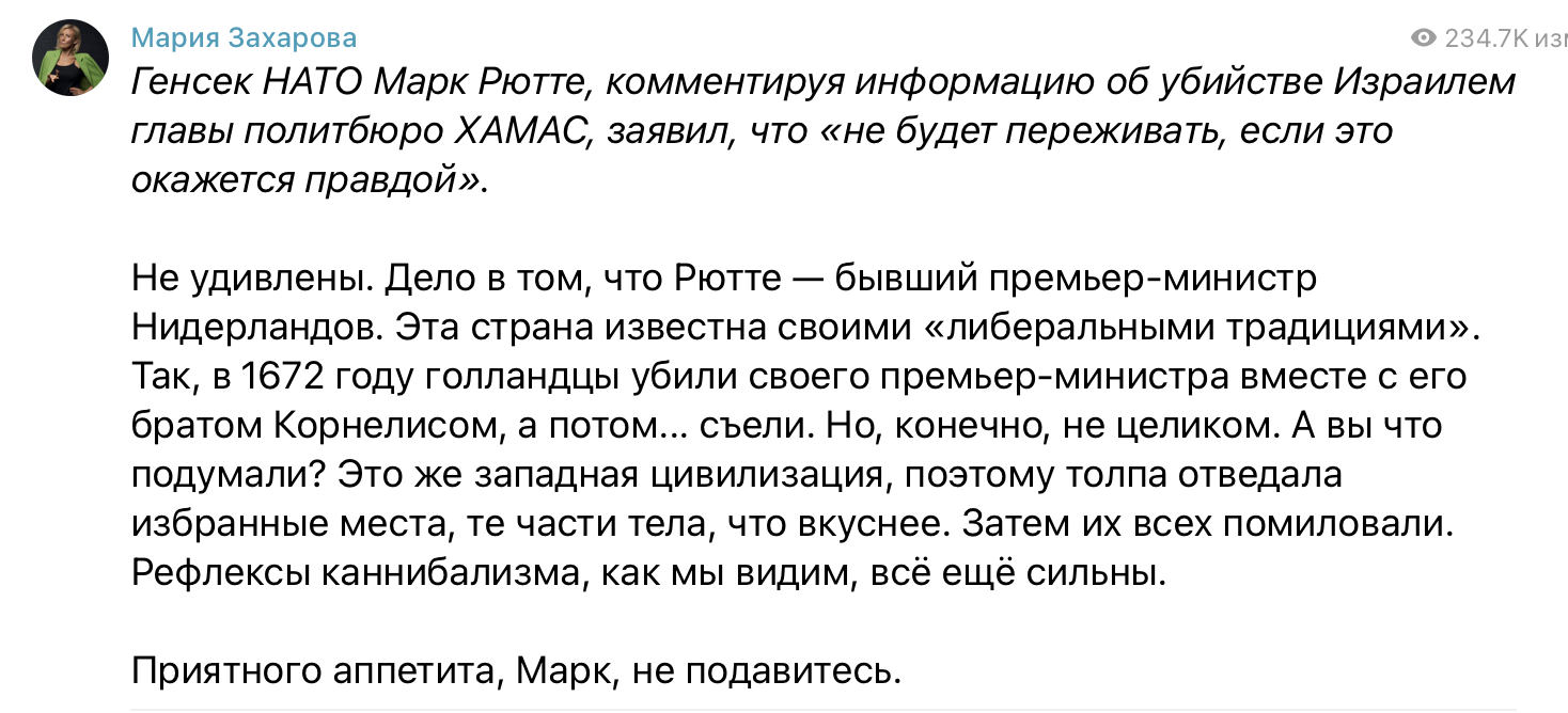 ЗЫ Маша Захарова, или Машка-бутылка, как ее иногда называют не решилась прямо осудить ликвидацию Синвара. Она осудила голландского политика, который одобрил эту казнь.