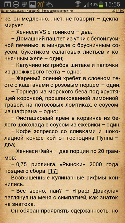 Блюда-то на самом деле Корецкий просто переписал из меню этого ресторана - тут все четко. Однако великосветский шик главного героя в виде Hennessy VS с тоником на аперитив - это пять баллов, официант точно должен был затащиться - как знаток. Хотя односолодовый виски с кока-колой тоже хорошо бы пошло. Ну и порции Hennessy Fine именно по 20 граммов - это признак настоящего супергурмана. Ему надо было заказать 19,384 граммов и обязательно измерить на молекулярных весах.