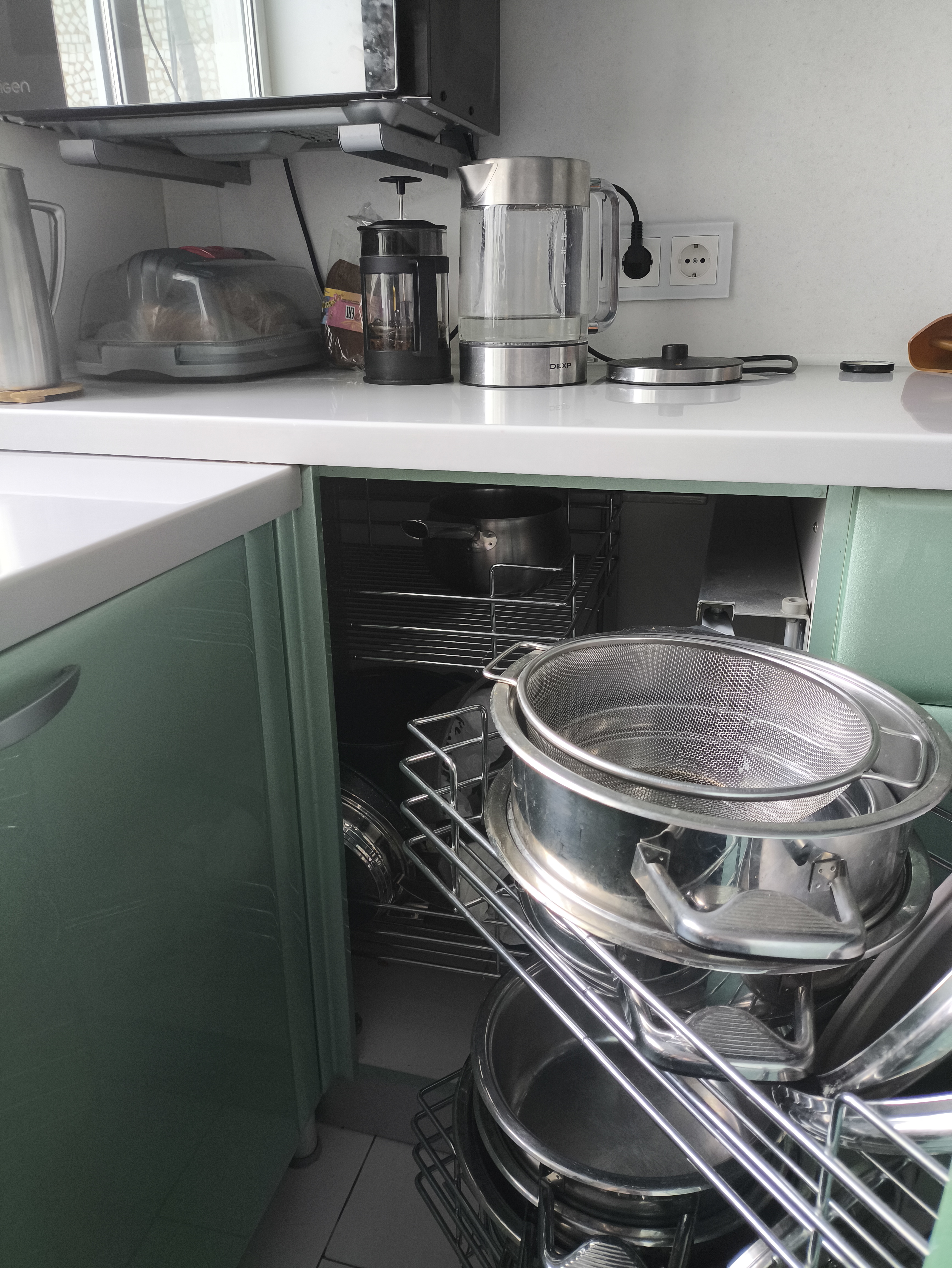 Может, просто в этот дальний угол засунуть то, что нужно раз в году? Например, обратный осмос. Или вторую пачку соды. По-моему, у любой хозяйки на кухне есть такие очень редконужные вещи.