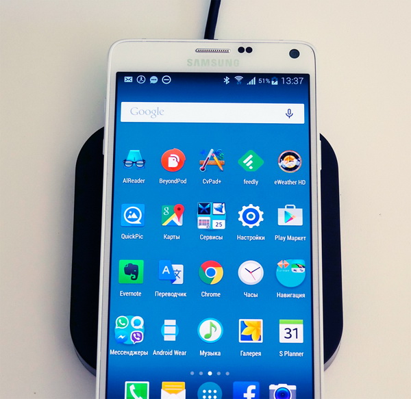 Для Samsung Galaxy Note 4 вроде бы не предусмотрена беспроводная зарядка - Samsung ее не выпускает. Тем не менее беспроводную зарядку для него можно приобрести.