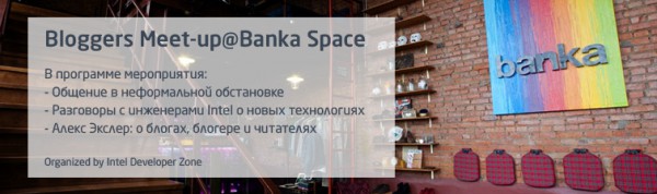 11 декабря команда Intel Developer Zone проводит мероприятие Bloggers Meet-up в Москве. Туда они пригласили блогеров из Intel, участников сообщества IDZ и самых активных комментаторов блога Intel на хабре. На встрече будет идти разговор о разработке софта, новых технологиях и проектах участников.
