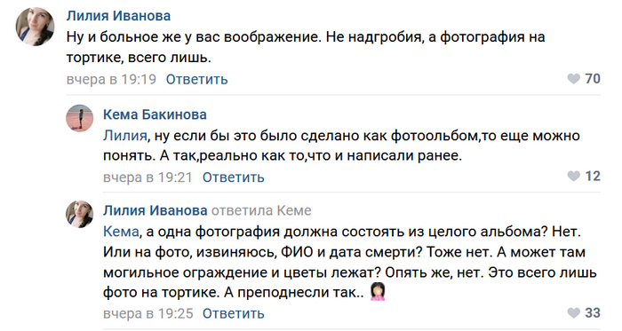 Следуя логике Лилия, - а даже если там ФИО и дата смерти с цветами, если раскопать трупа же нет? Значит это всего лишь фото на тортике.