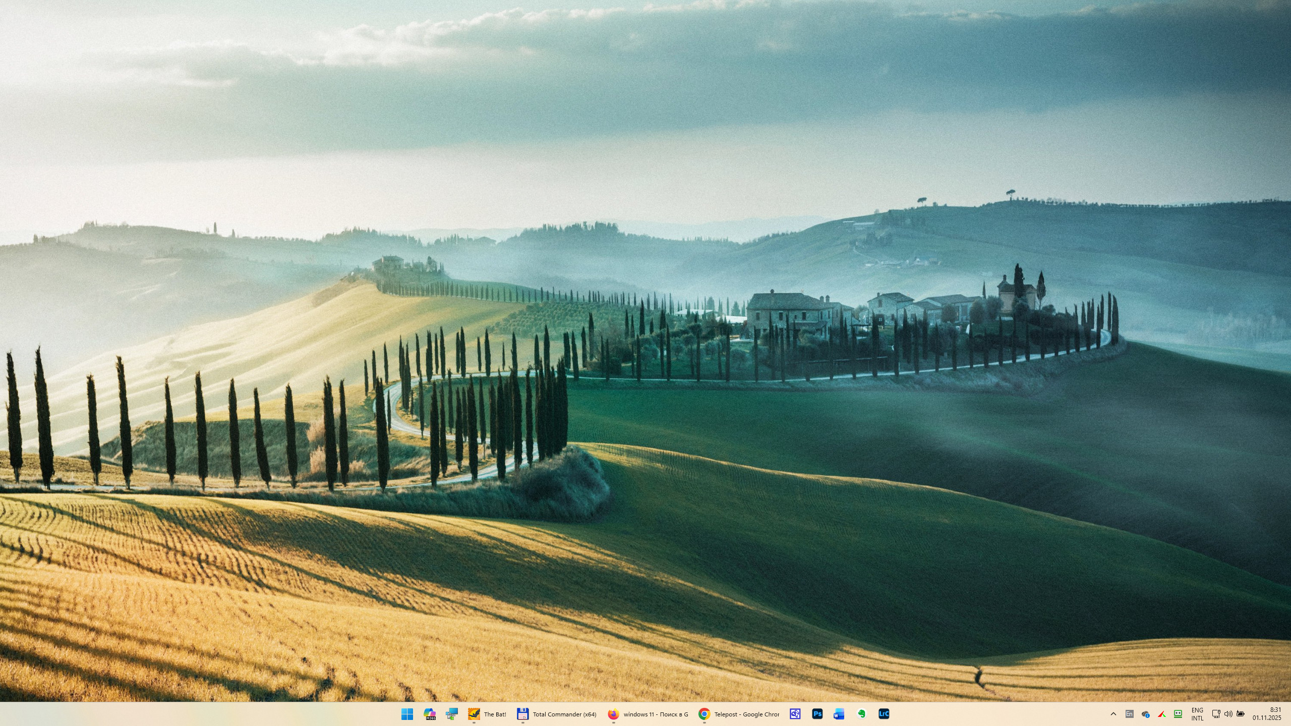 Десктоп у меня вот так теперь выглядит, несмотря на то, что я уже не использую телевизор OLED в качестве монитора. Просто привык без иконок на рабочем столе, вполне хватает иконок и папок в меню "Пуск". Картинка обоев меняется каждую минуту - фото берется из папки с пятью сотнями изображений: там, в основном, всякая природа, куда также скопированы некоторые фото, которые я делал сам, ну и немного архитектуры.