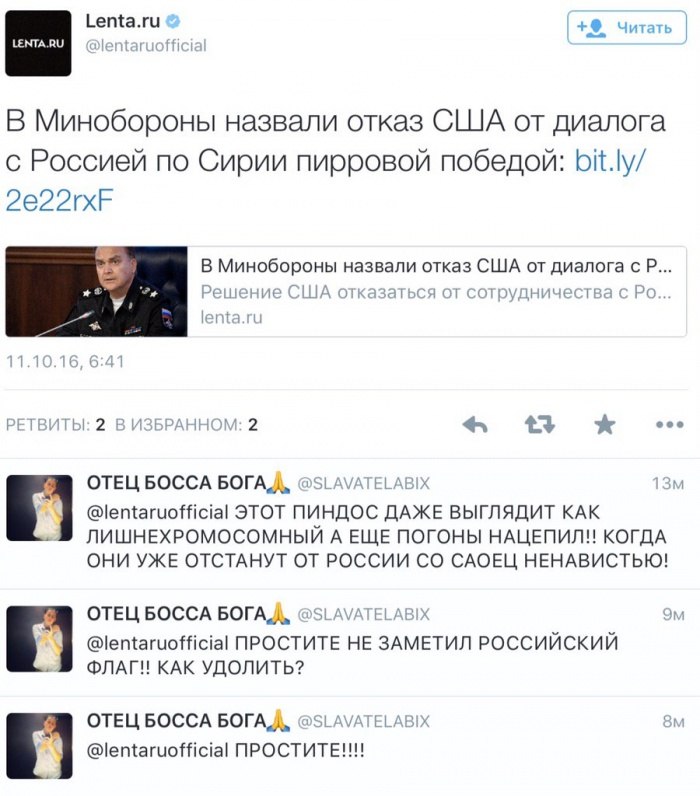 «Гуманитарная резолюция, представленная Россией, западные страны не устраивает, это выдает истинные цели спонсоров первой так называемой гуманитарной резолюции Совета, и это как раз является настоящим лицемерием и цинизмом. Еще одним цинизмом является то, что на нас выходят коллеги из многих делегаций и жалуются на беспощадное давление и выкручивание рук со стороны западных партнеров вплоть до экономического шантажа и угроз», — подчеркнул Небензя. (Отсюда.)