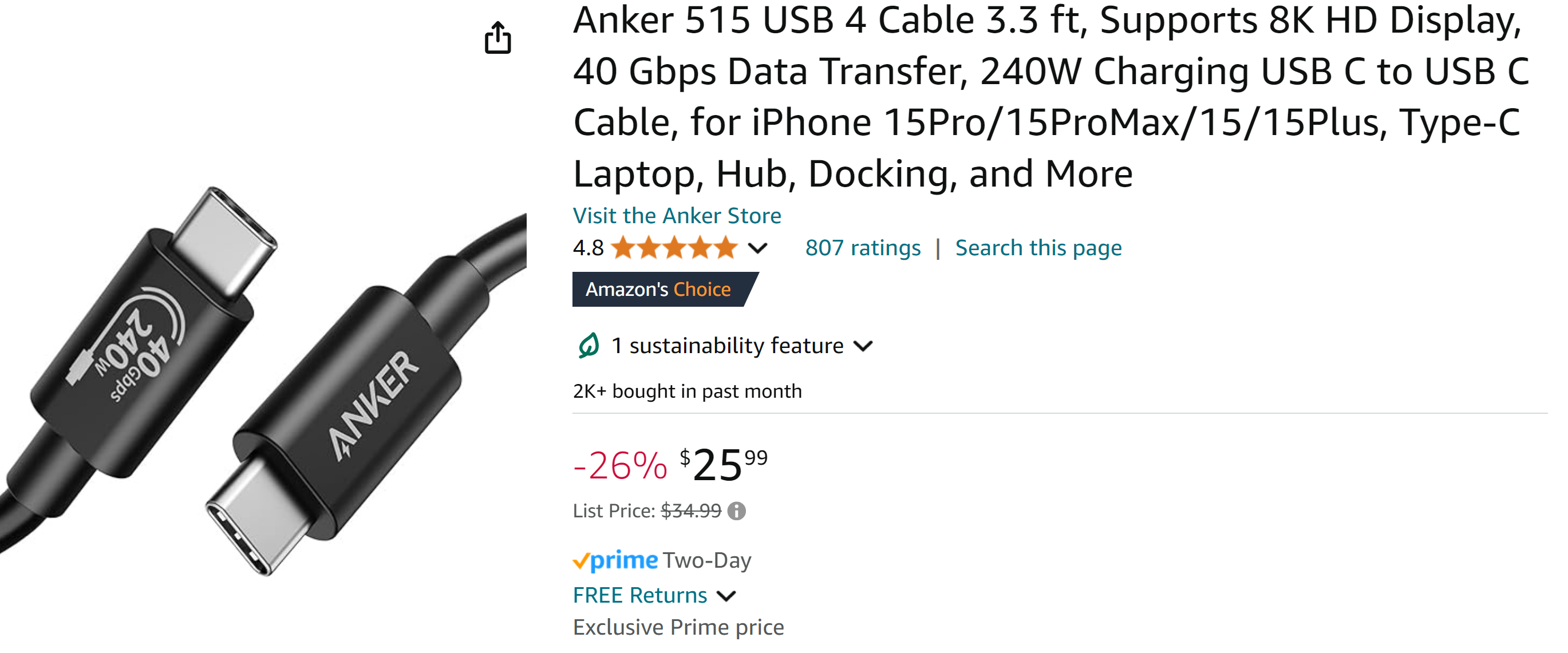 А ваш кабель за 3 бакса обеспечит 100+Вт зарядку и одновременно скорость передачи 20-40Гбит?