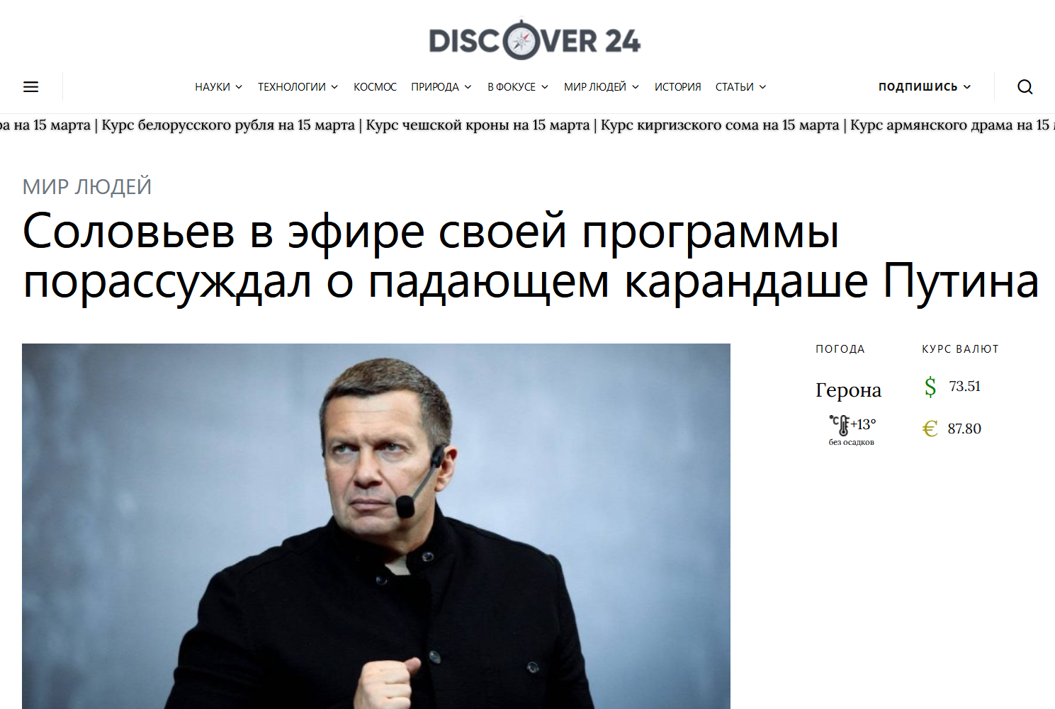 Соловьев в прямом эфире восхитился тем, как Путин поймал карандаш. Боевые искусства, сказал Соловьев, никуда не уходят.