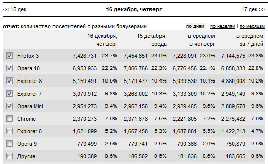 Недавно NIX подводил такую же статистику посещений своего сайта - результаты были аналогичны. Лично я на Опере с 5-й версии ещё с 2000-го года, с тех пор, когда она была условно платной (нужно было заплатить за отключение рекламного банера, но все просто хакали или забивали). Слезать с неё не собираюсь.