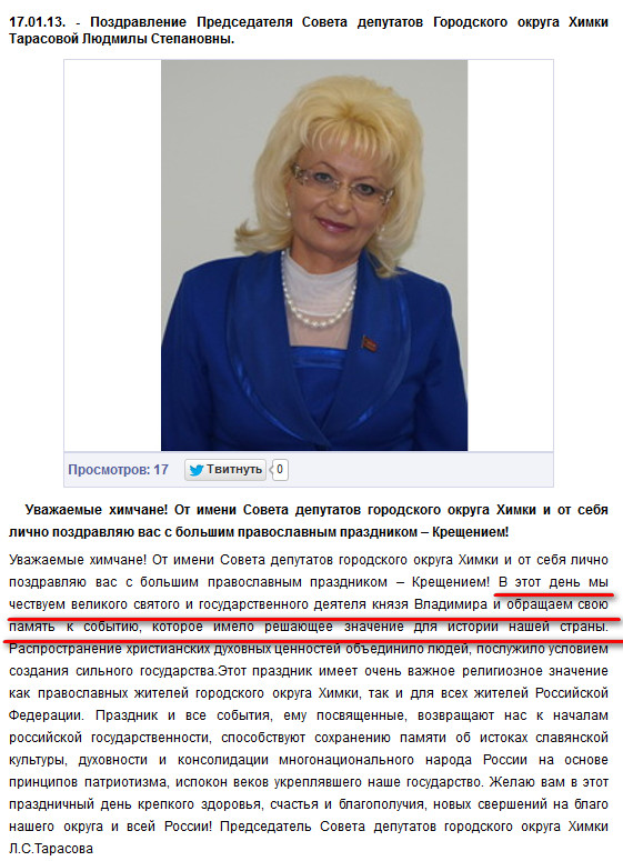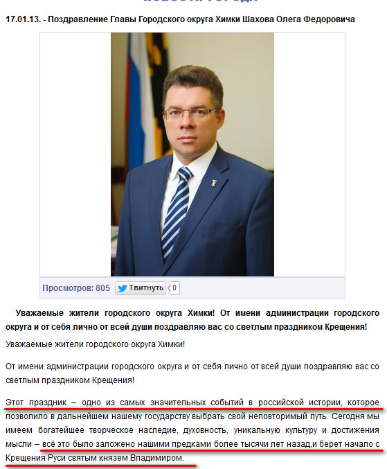Прочитайте и заплачьте от счастья. Это с официального сайта города Химки. Интересно, этим альтернативно одаренным кто-нибудь расскажет, что сегодня отмечается Крещение Господне, а не Крещение Руси? Верующие, my ass...