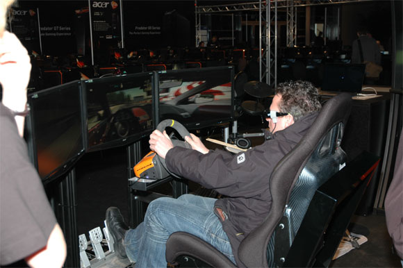 Еще там показали симулятор гоночного болида аж на трех мониторах со специальной установкой с рулем, и симулятор тоже был трехмерный. Смотрелось круто, я покатался.