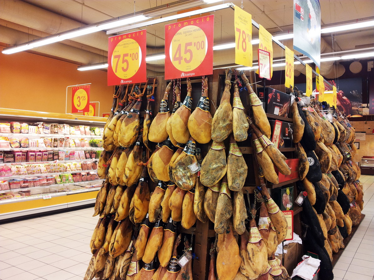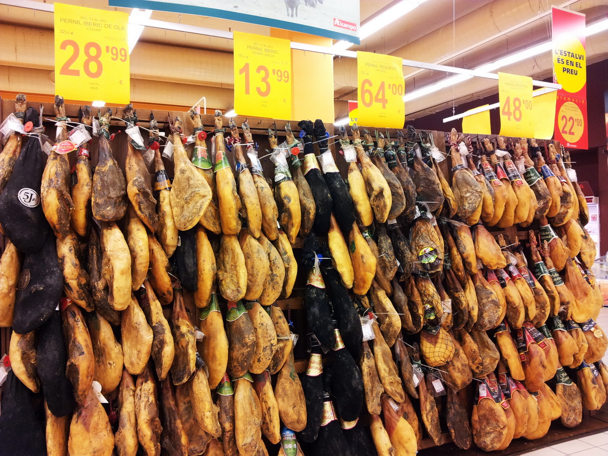 Вот набор в местном "Ашане" (он тут называется Alcampo). Это все цены за килограмм, так что ножки получаются сильно недешевые: палета (передняя ляжка) - примерно 4 кило, хамон (задняя ляжка) - примерно 8 кило.