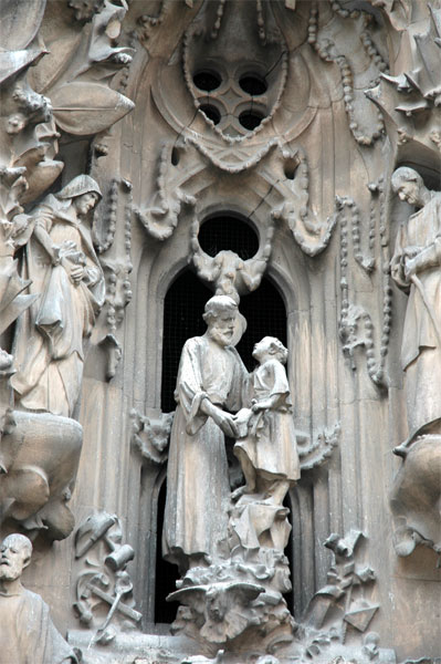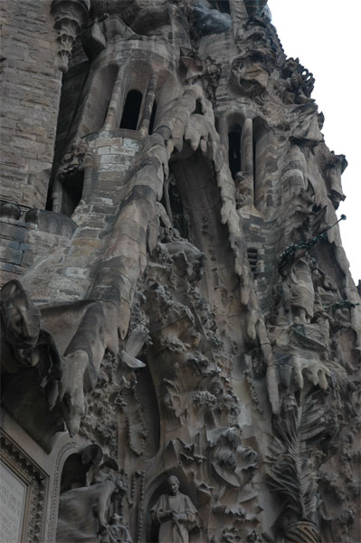 Фасад страстей Христовых сравнительно новый, достраивал его уже после смерти Гауди другой архитектор по наброскам мастера. На всё творчество Гауди влияла природа, которая окружала его с самого детства, в музее при соборе подробная фотовыставка на эту тему. Например, ворота от сделал похожими на пчелиные соты, колонны и шпили - некие растительные образы. А когда человек заходит во внутрь, он попадает в тропический лес, где должен испытывать единение с природой и своей душой и не чувствовать гнета религии. «Это будет подобно лесу. Мягкий свет будет литься через оконные проёмы, находящиеся на различной высоте, и вам покажется, что это светят звёзды» (с) Антонио Гауди. Он прекрасно понимал, что не успеет при жизни увидеть своё главное детище в законченном виде и говорил, что потребуется не одно поколение, чтобы закончить им начатое, и что его клиент не спешит, ведь чего-чего, а времени у Бога предостаточно.