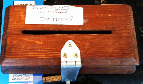 Там же все понятно: "Оставьте поуайлуста чайвые!!!!! Tea piease!"