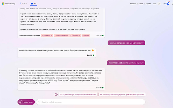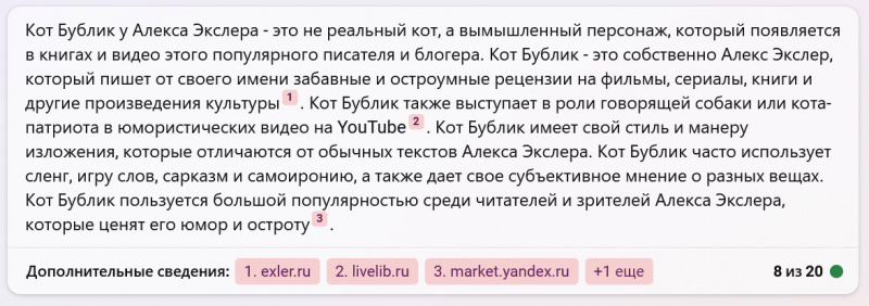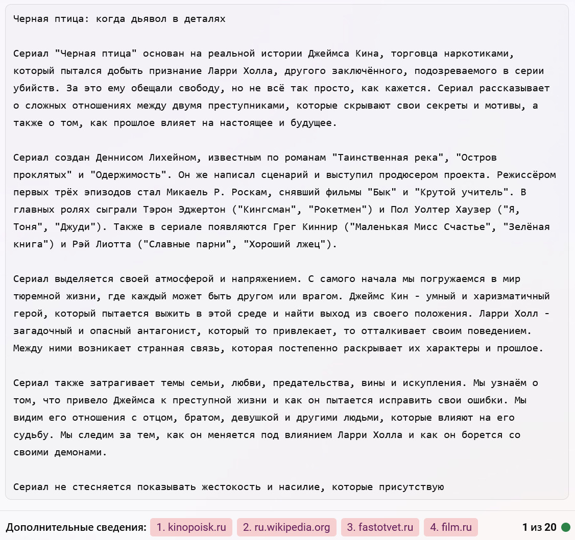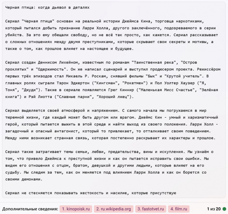Вот, например, что он выдал на запрос "Напиши кинорецензию на сериал "Черная птица" в стиле Алекса Экслера".