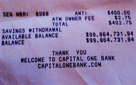 А уж если какой-то сторонний банкомат рассказывает про 100М долларов на счету - да и господь с ним. Денег таких он все равно не выдаст, даже если карточку с написаным пин-кодом к этому типа чеку скрепкой прицепить и там подвесить.