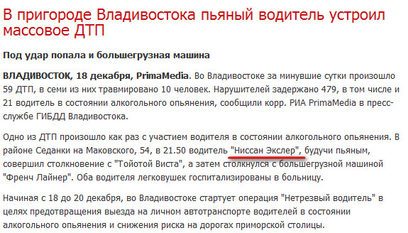 Кавычки съехали. На самом деле ...водитель "Ниссан" Экслер, будучи пьяным,... Вот так развлекаются во Владивостоке популярные московские блоггеры. В-общем, позор тов.Горбункову, пьянице и дебоширу. 😄