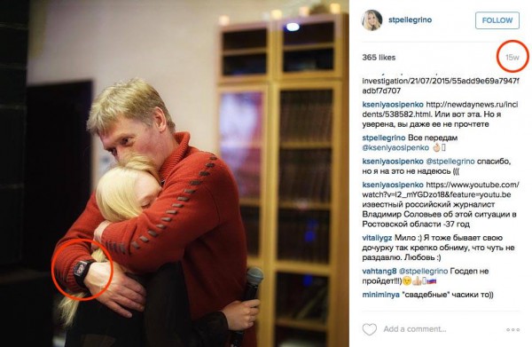 - Во время свадьбы Песков понимал, что его будут фотографировать, а карточки потом разлетятся по интернету. Во время подготовки к свадьбе тоже ходило столько слухов, что гостям было что обсудить и над чем посмеяться позже. Вот и в этом случае молодожены решили подшутить. Песков на время одолжил часы у кого-то из своих знакомых, которые присутствовали на торжестве. Попозировал с ними. Мы ждали, что журналисты отреагируют на эту утку. И не ошиблись. На следующий день все стали подсчитывать, сколько стоят часы, и каким образом чиновник мог на свою скромную зарплату приобрести такую роскошь?.. (Отсюда.)