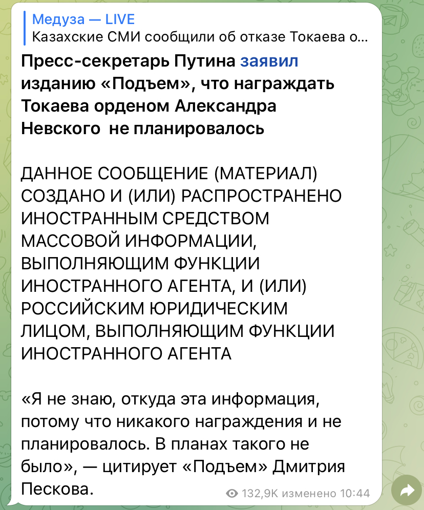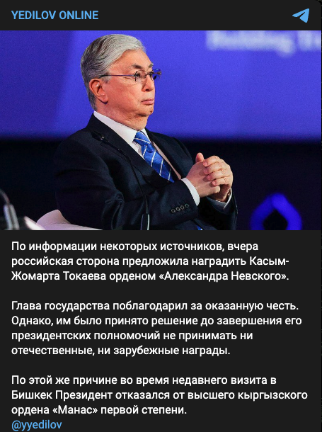 Что награждение Токаева орденом в России - это исключительно из телеграмма никому не известного казахского политолога.