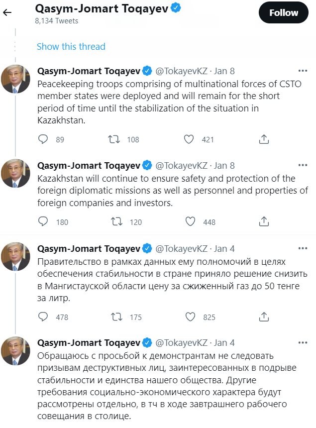 Плюс ты так и не дал никакие пруфы даже после просьбы сделать это. Ответ "Я в Казахстане живу и все знаю" это не пруф. Еще ты писал, что Токаев не твиттил про террористов, пришлось персонально для тебя даже запостить скриншот из его твиттера после чего ты удалился из обсуждения по английски.