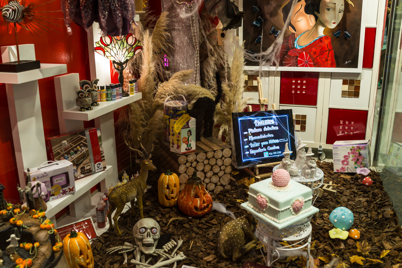 Некоторые Хэллоуинские традиции, которые сюда пришли из Ирландии-Великобритании (так же, как они пришли и в Штаты) здесь проявляются в том, что во всех магазинах продаются знаменитые хэллоуинские тыквы, которые, впрочем, особой популярностью не пользуются, я их очень мало где видел в праздник. Но зато витрины некоторых магазинчиков оформляют, выставляя туда всякие забавные фигурки - вот как здесь, например.