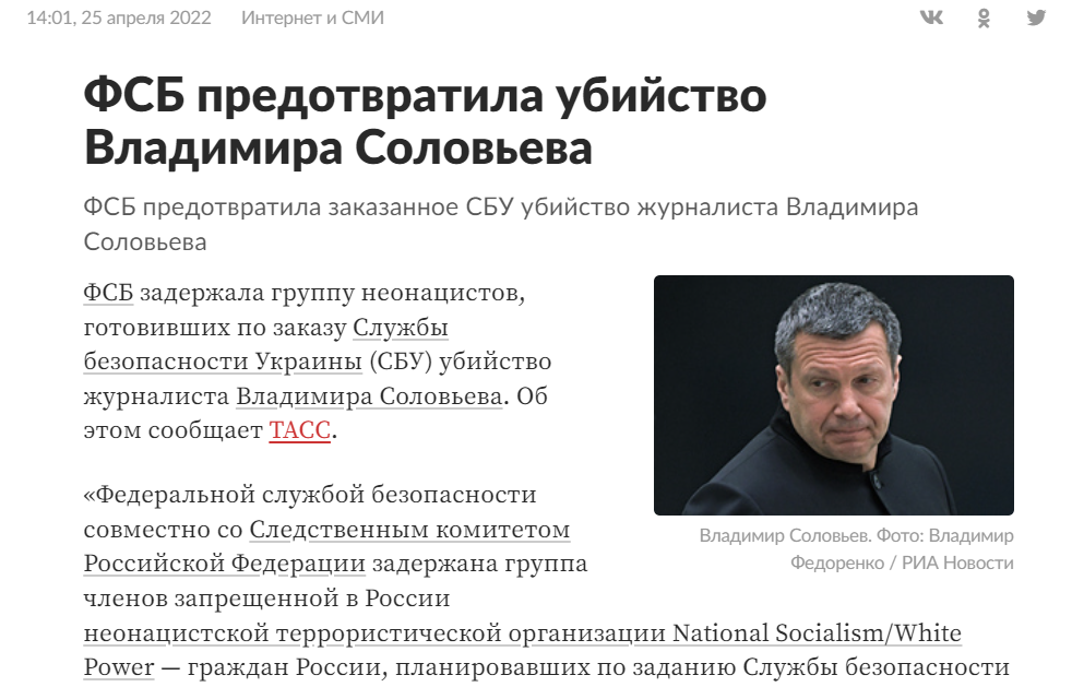 членов запрещенной в России неонацистской террористической организации National Socialism/White Power — граждан России, планировавших по заданию Службы безопасности Украины убийство общественного деятеля, известного журналиста Владимира Соловьева», — говорится в сообщении.