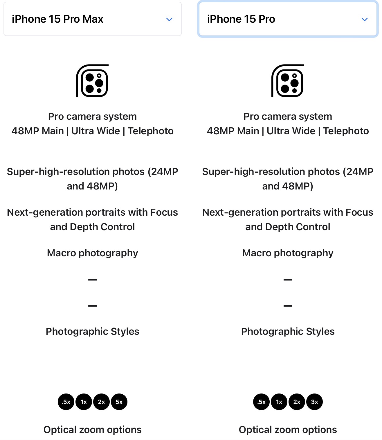 У Pro и Pro Max набор камер одинаковый (раньше отличались): основная камера 48 Мпикс, 1/1.28", dual pixel PDAF, sensor-shift OIS, video 4K 120fps; сверхширик 48 Мпикс, 12 Мпикс 5-кратный оптический зум 1/3.06".