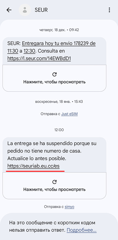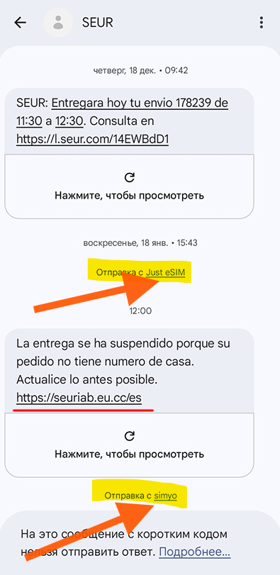 И, главное, SMS пришло типа как от Seur, и его показали внизу длинного списка реальных SMS от Seur. Поэтому я чуть было не купился.