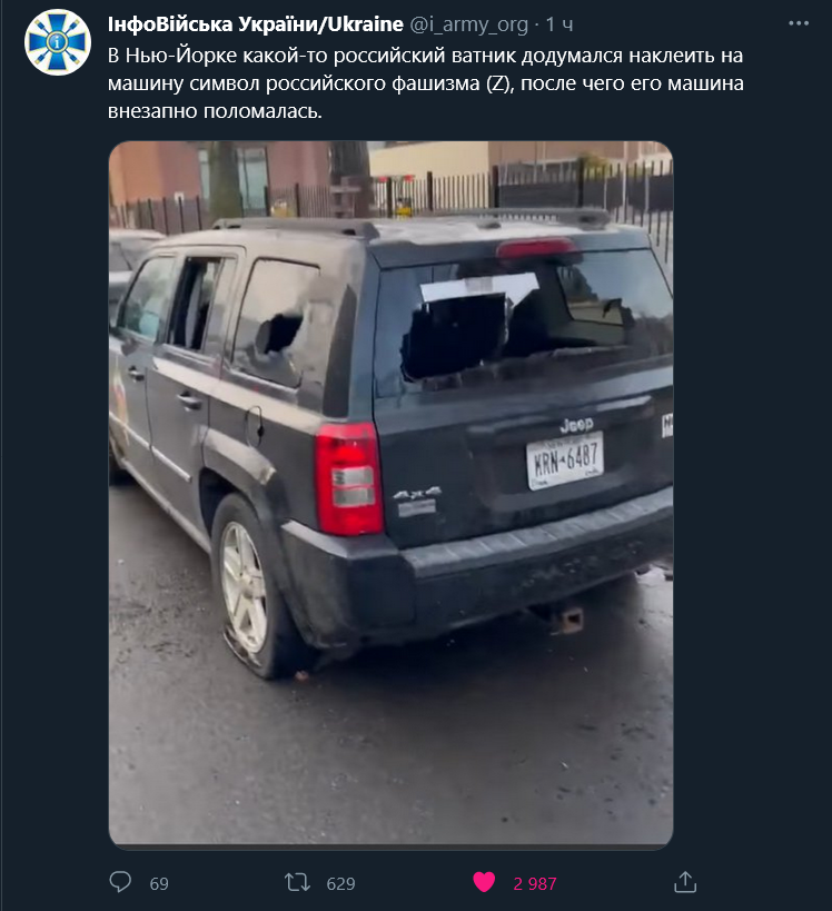 Вот вчера повстречал на дороге это тело. Нацепил на заднее стекло флажок России, георгиевскую ленточку. А между ними здоровенную Z.