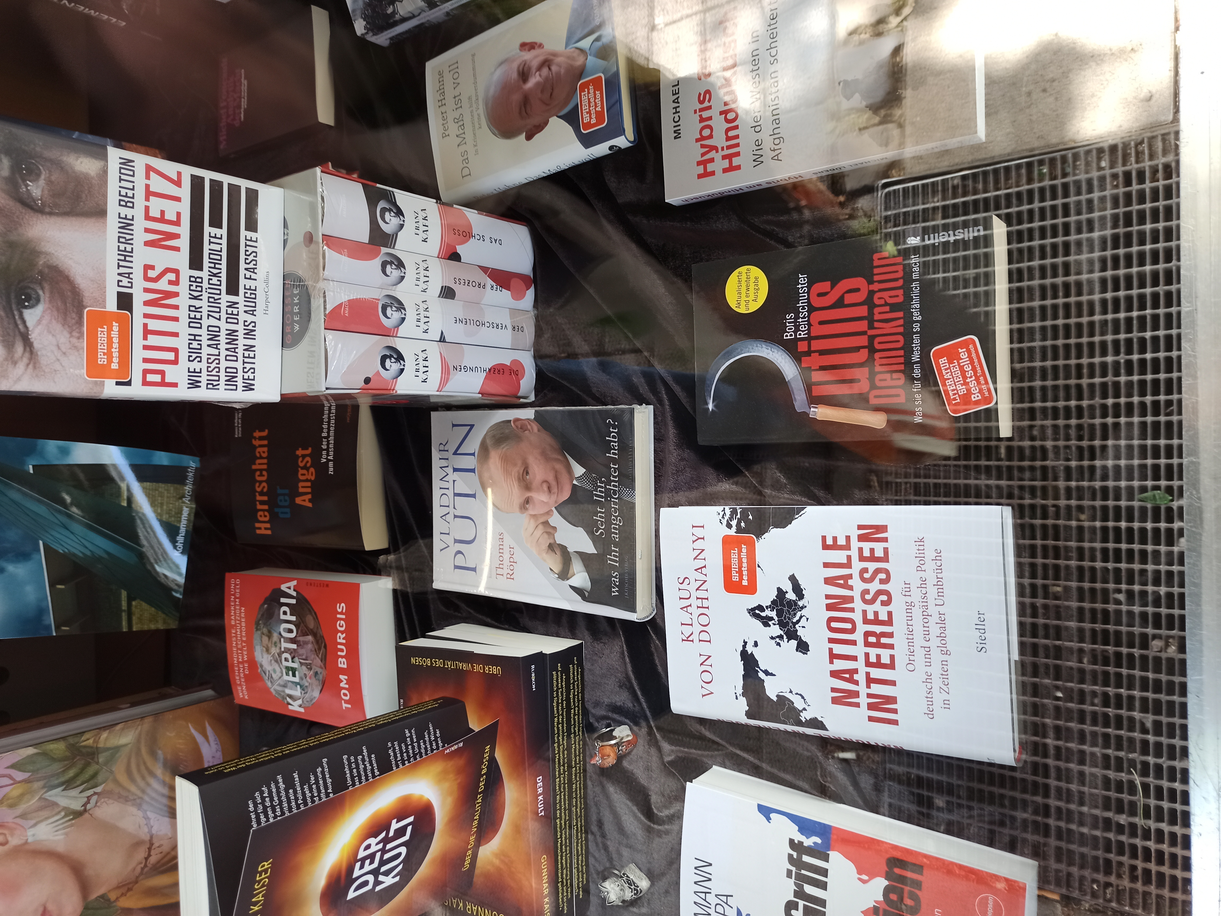 Ну и внизу, книга с серпом - "Демократура Путина" Бориса Райтшустера. Надпись под заголовком - "Что делает её такой опасной для Запада". Издание обновлённое и дополненное.