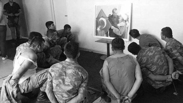 На фото Турецкие офицеры, пытавшиеся арестовать президента Эрдогана, в наказание смотрят на его фотографию целый день. Турция, июль 2016 года.