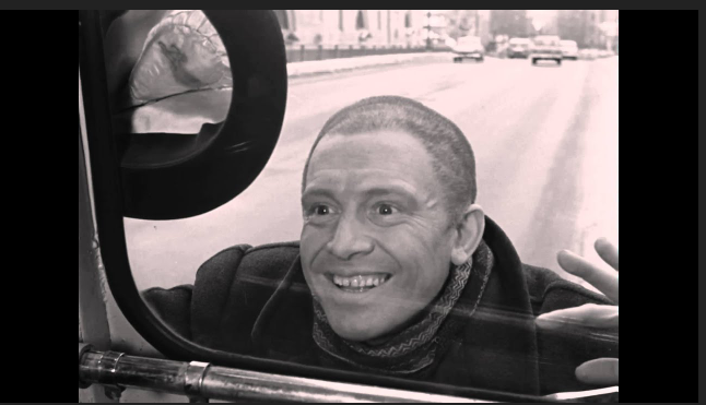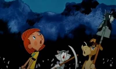 Галчонок налетает на лопату, которую несёт на плече Шарик, и падает в руки Дяди Фёдора, выпуская из клюва монету.